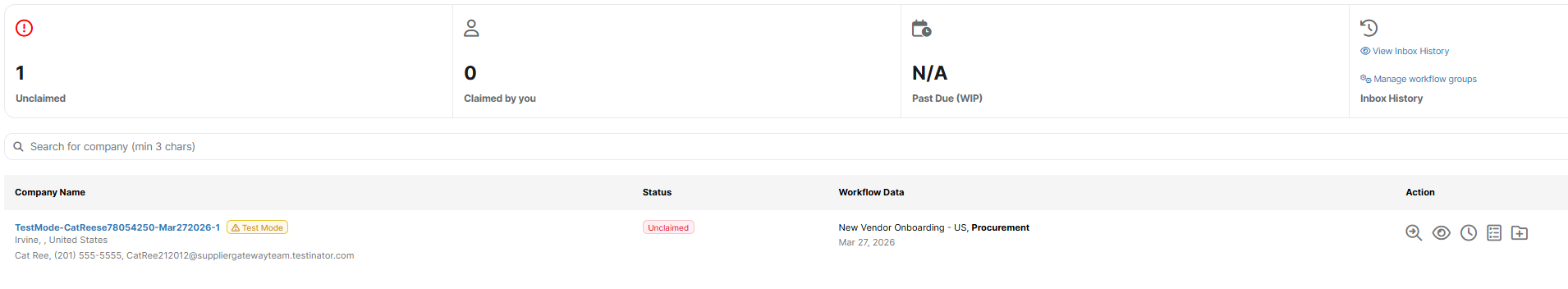 - Supplier record appears as an unclaimed item in the Inbox